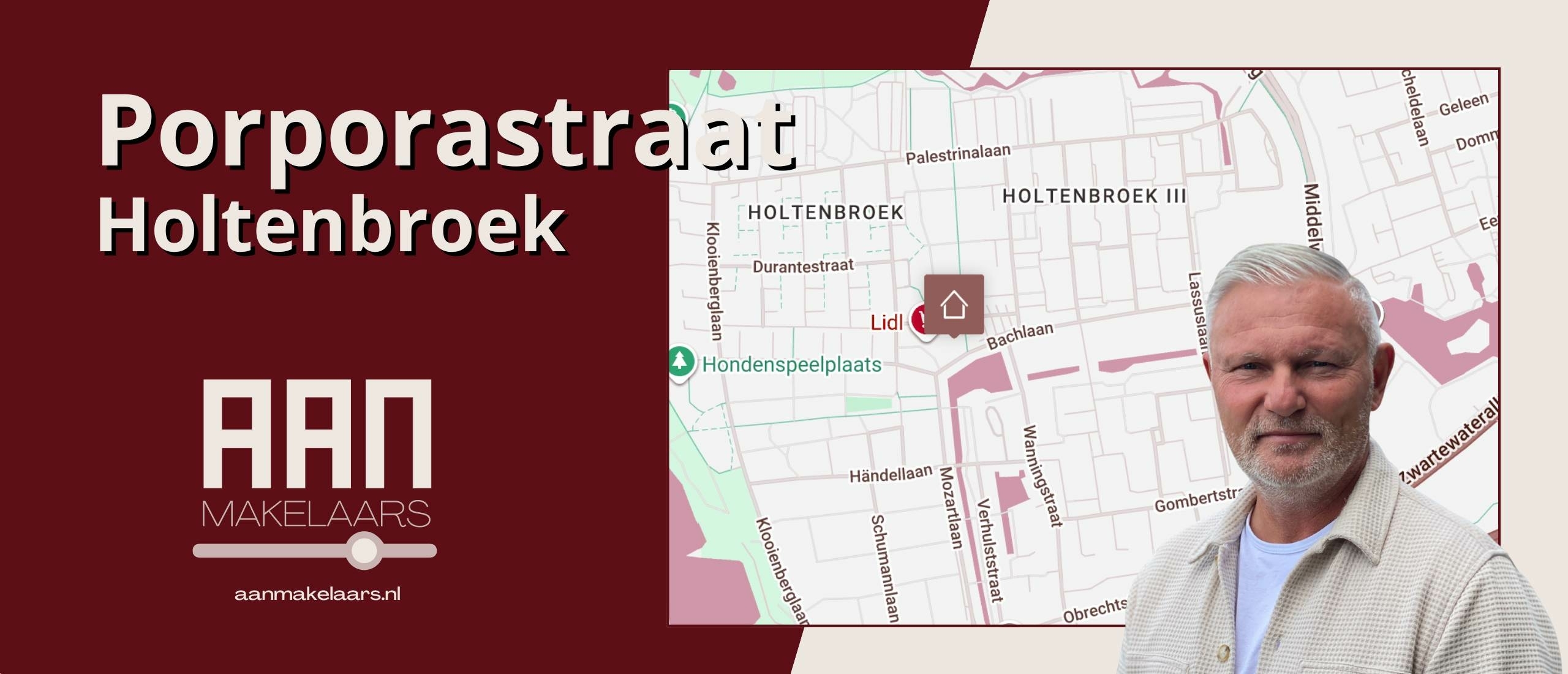 Porporastraat 180 ligt in Holtenbroek II, een deel van de wijk Holtenbroek dat is ontworpen als naoorlogse stadsuitbreiding met veel ruimte voor flats, groenstroken en brede wegen. Het winkelcentrum onder het complex voorziet in dagelijkse boodschappen en basisvoorzieningen. Bushaltes liggen op korte loopafstand en de binnenstad van Zwolle is binnen enkele fietsminuten bereikbaar. Rondom het gebouw liggen voetpaden, parkeren in de omgeving en groene stukken langs de hoofdwegen die de wijk verbinden met de rest van de stad.